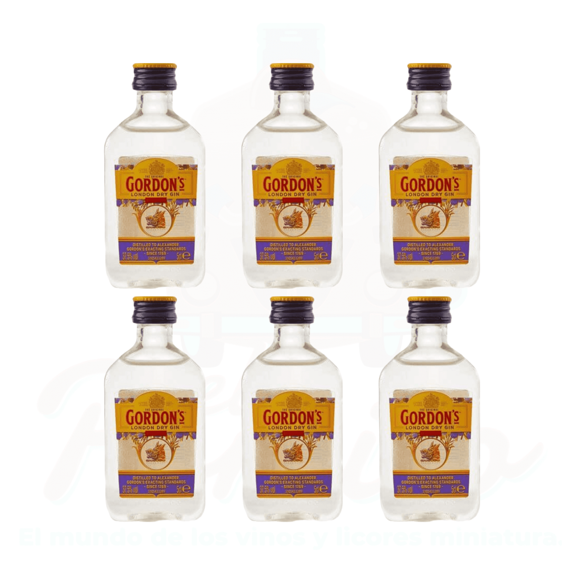 6 Piezas de Mini Ginebra Gordon's London Dry Gin 50 ml. Botellita de plástico. 37.5% Alc. Vol.