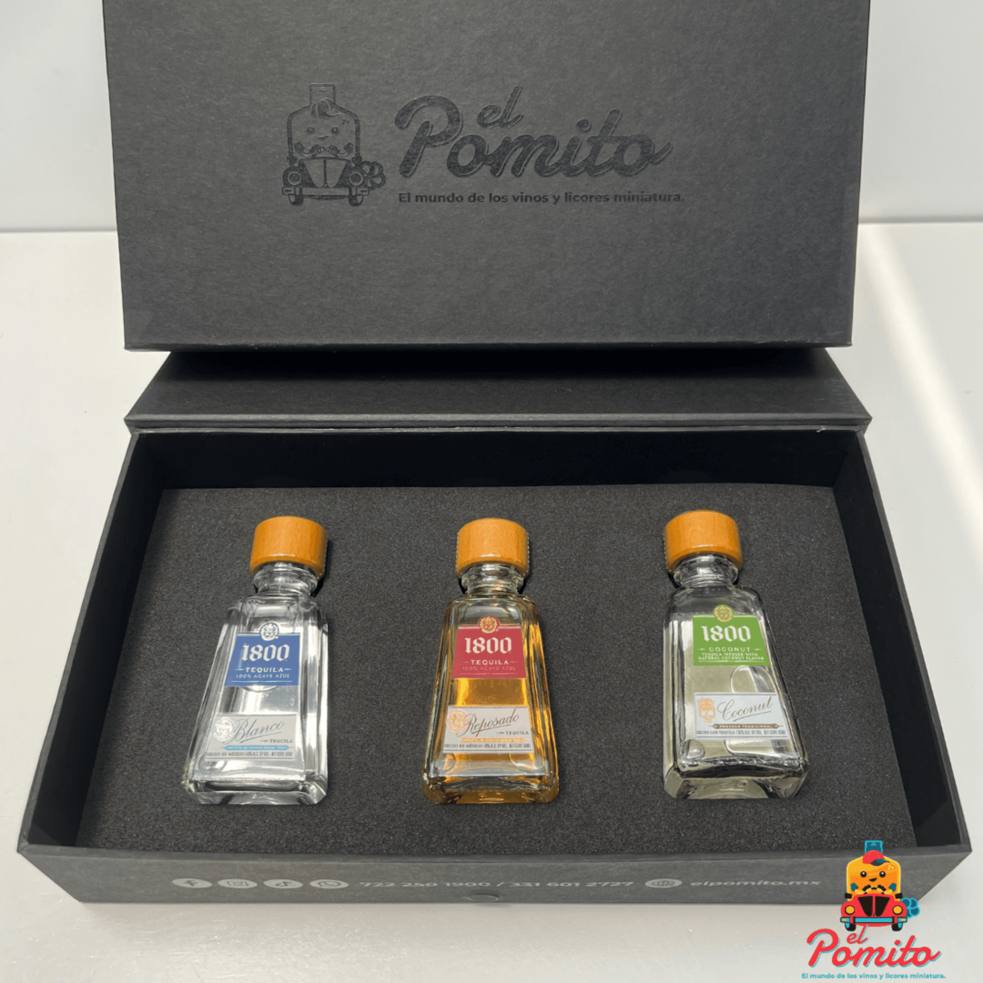 Contiene; 1 Estuche y 3 Mini Pomitos de 50ml. 1800 Blanco, Reposado y Coconut.