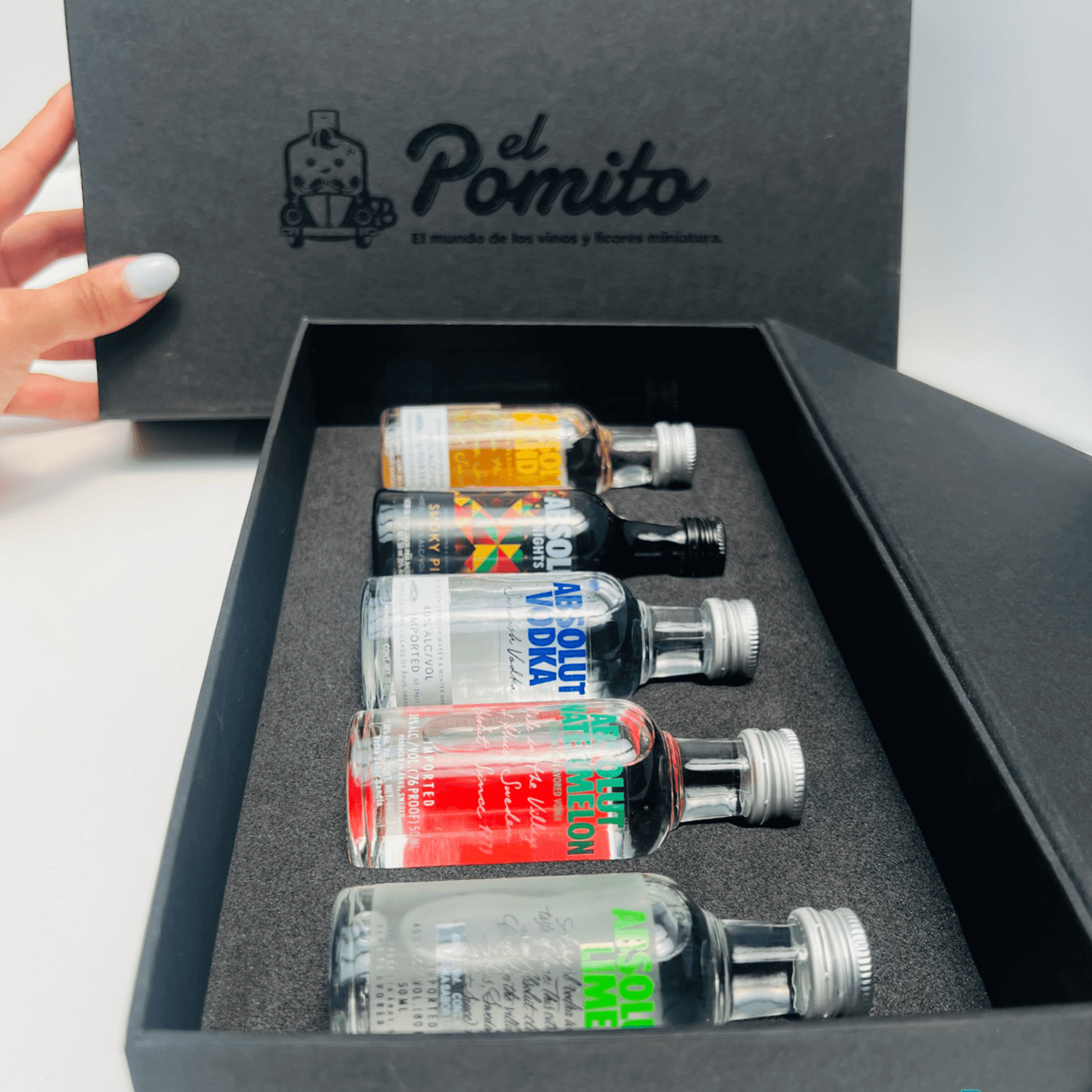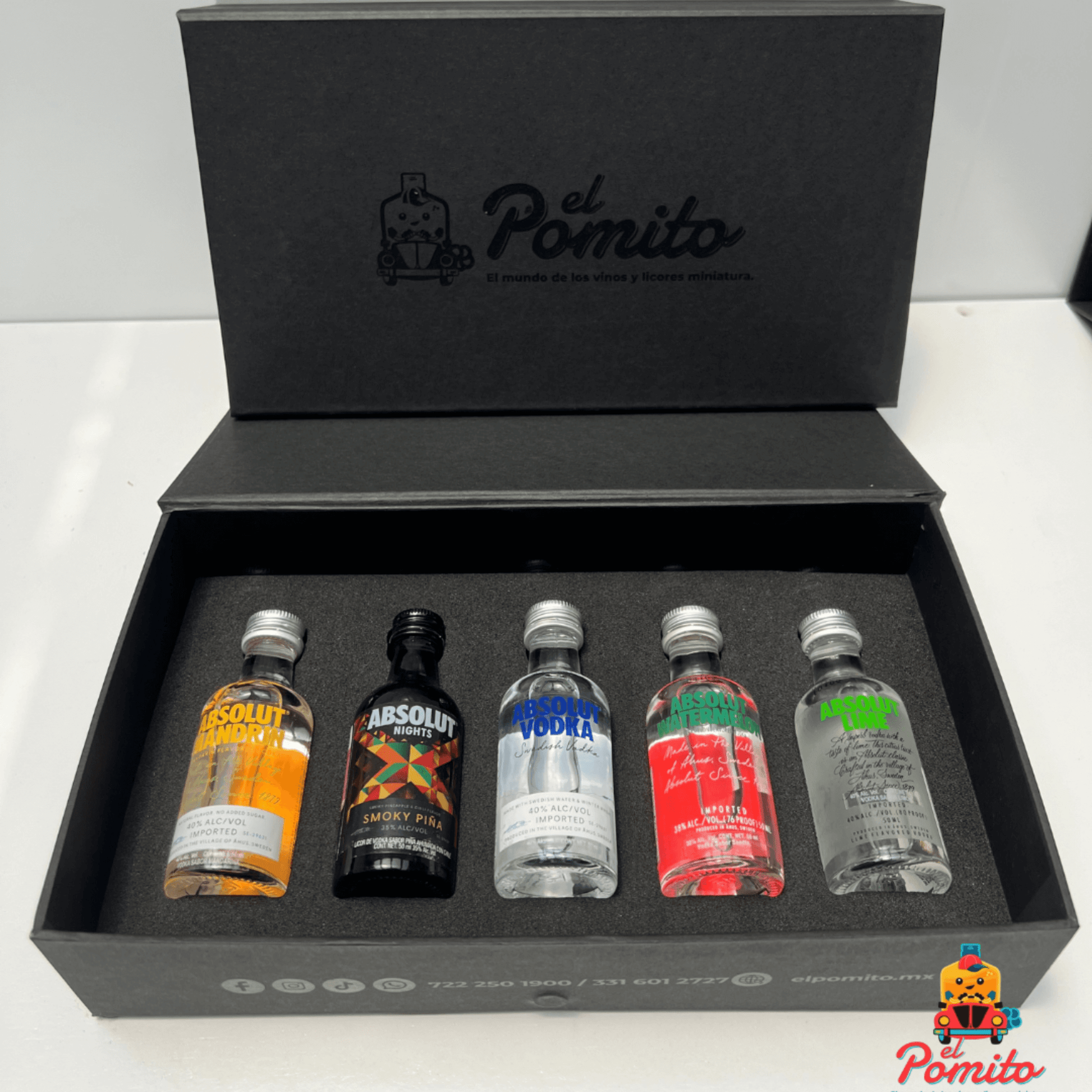 Contiene; 1 Estuche y 5 Mini Pomitos de 50ml. Absolut Mandarin, Piña, Azul, Watermelon y Lime.