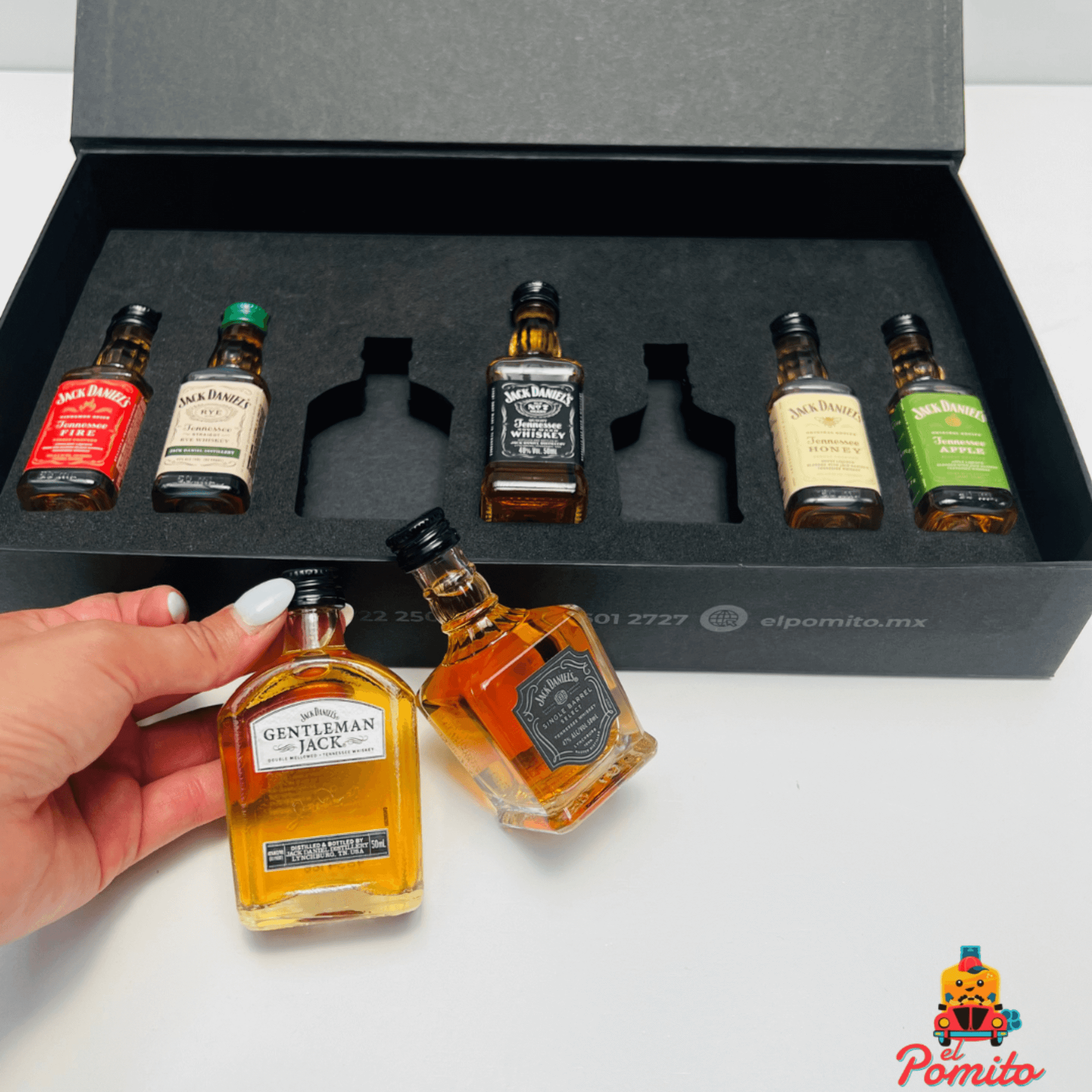 Contiene; 1 Estuche y 5 Mini Pomitos de 50ml. Jack Daniels Fire, Rye, Gentlenman, Old No.7, Single Barrel, Honey y Apple.